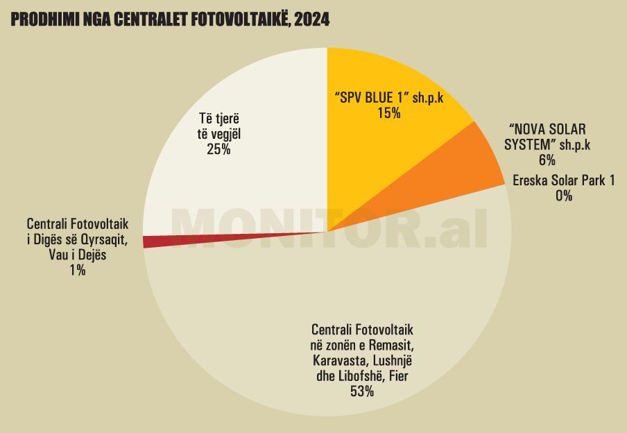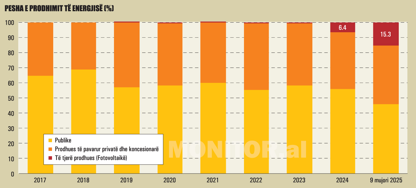 Energjia fotovoltaike përbën rreth 15.3% të prodhimit neto të energjisë në vend për të njëjtën periudhë, më shumë se dyfish krahasuar me vitin 2024. Pritshmëria është që kjo peshë të vazhdojë të rritet progresivisht, ndërsa numri i centraleve që hyjnë në operim mbetet në rritje të vazhdueshme.